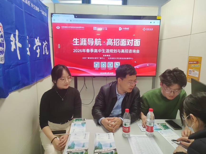 3月28日上午,由外交学院外交学与外事管理系雷建锋教授、王书畅同学和学生处招生办邱雨乾老师组成的招生宣传团队,应邀参加由北京广播电视台城市广播中心与北京高校大学生就业创业指导中心联合主办的“生涯导航·高招面对面”——2026高中生涯规划与高招咨询会。
