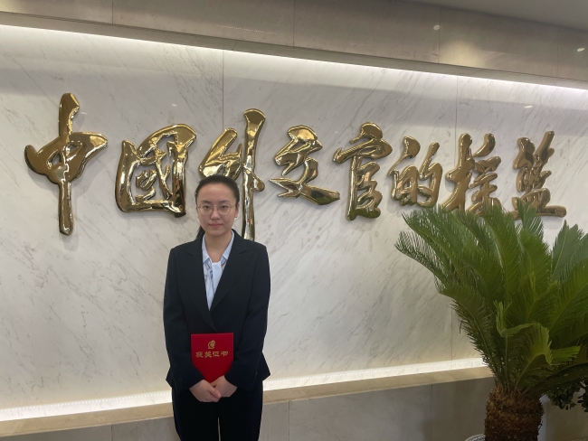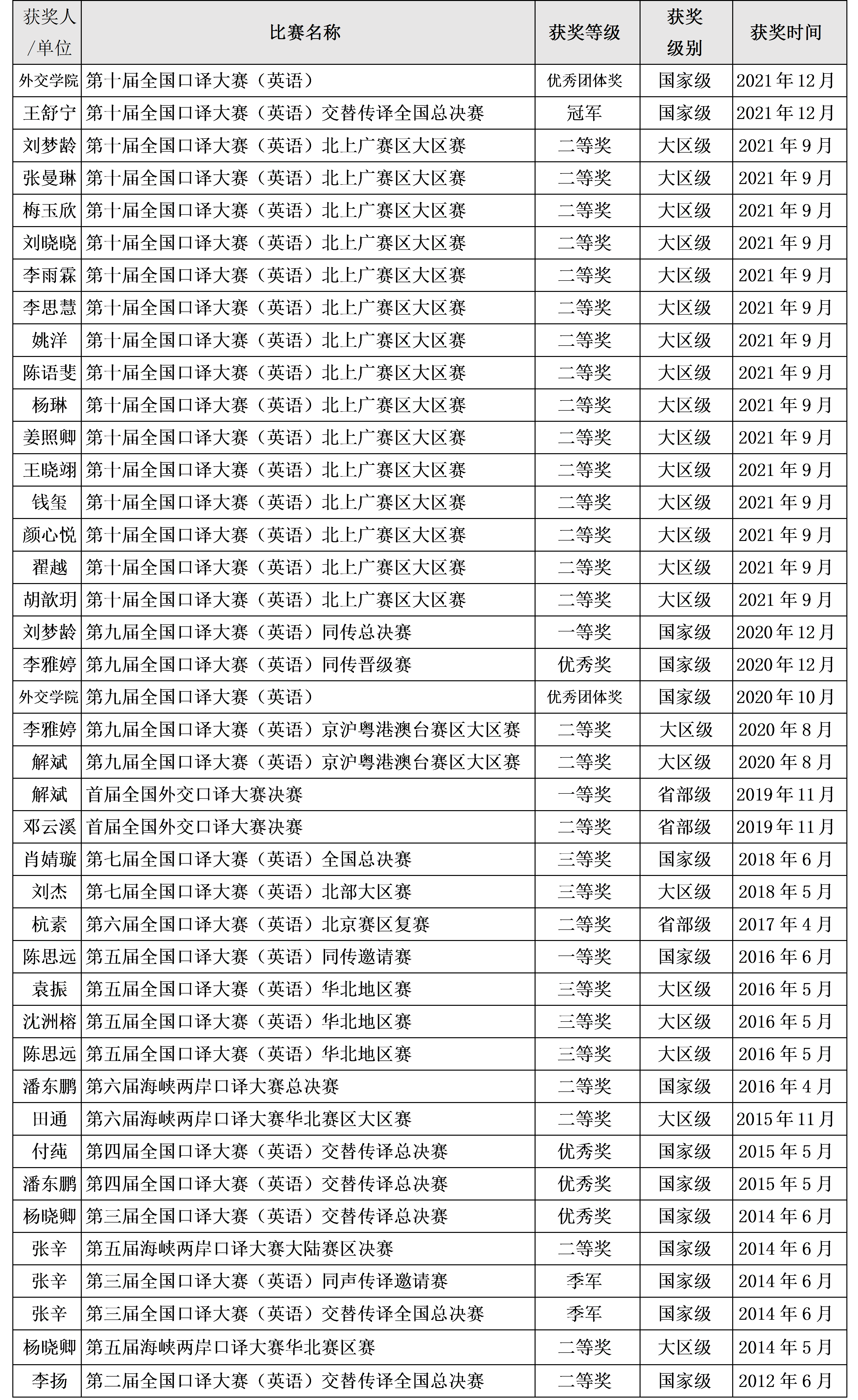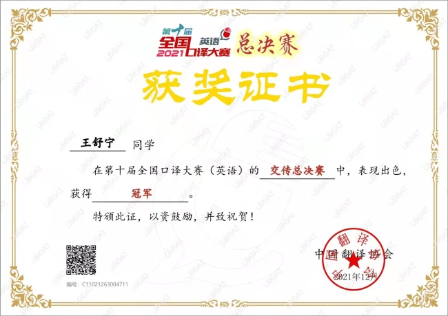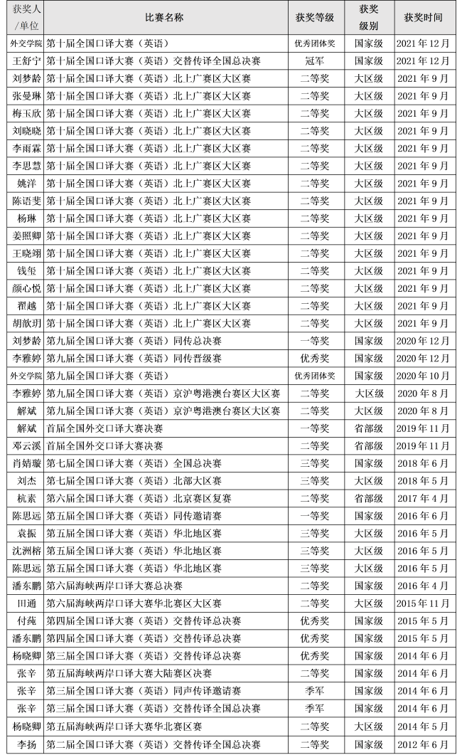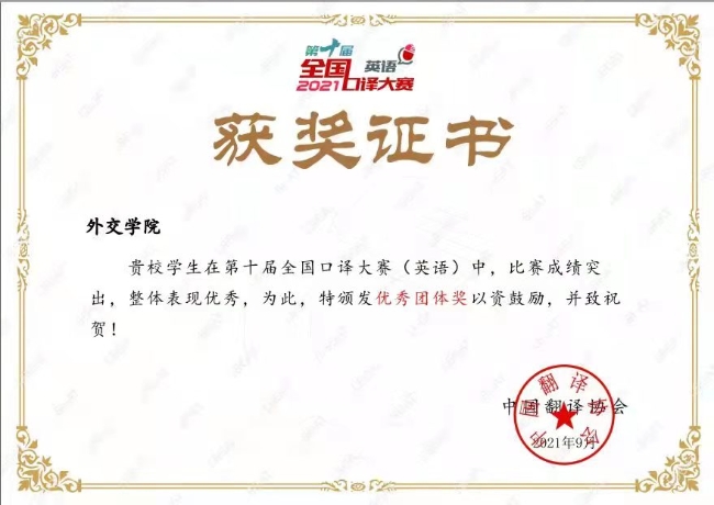 第十届全国口译大赛(英语)交替传译总决赛于2021年12月在线上顺利举行。在12日的70进10全国总决赛中,共有来自全国五大赛区的70名选手参加,我院英语系王舒宁同学获一等奖并晋级十强全国总决赛。在26日的十强全国总决赛中,来自外交学院、北京外国语大学、上海外国语大学、广东外语外贸大学、复旦大学、浙江大学等高校的十强选手为争夺冠亚季军展开激烈角逐,王舒宁同学脱颖而出,荣获冠军。外交学院获优秀团体奖,带队老师邹洋洋获优秀指导教师奖。