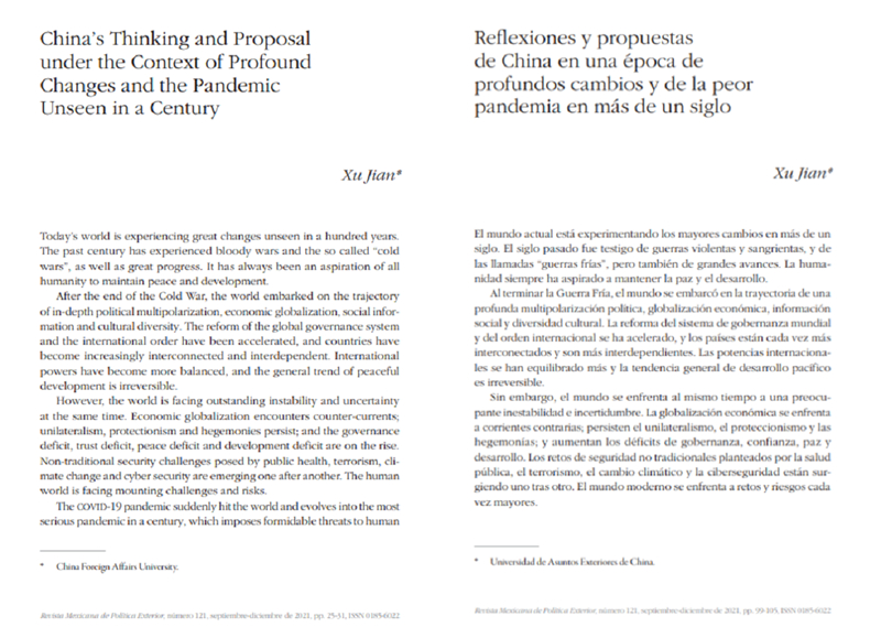 近日,墨西哥《外交政策》杂志第121期以英语、西班牙语双语刊发外交学院兼中国外交培训学院院长徐坚署名文章《百年变局与世纪疫情下的中国思考和中国答案》。文章结合党的十八大以来中国外交成功实践、伟大成就,全面深入阐述了习近平外交思想博大精深的思想内涵、核心要义和精神实质,系统论述了当今世界大势和新时代中国外交的历史方位、历史使命、基本原则和独特风范。文章还全面介绍了中国外交培训学院教育培训工作和中国外交官培训以及国际交流合作历程、成果等情况。