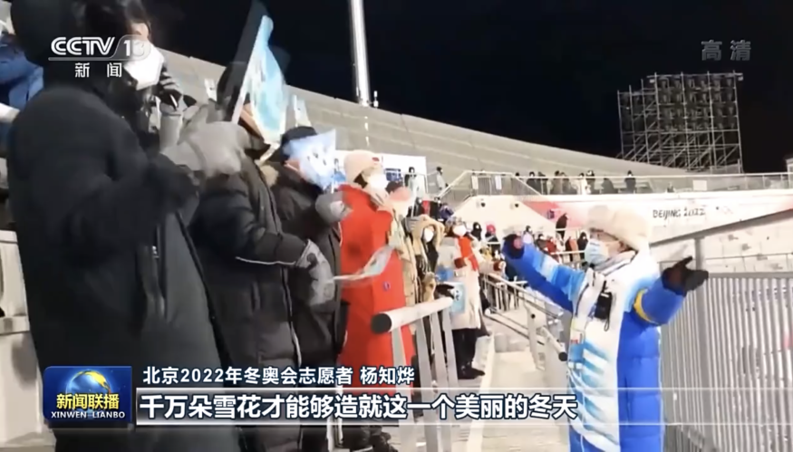 2月27日,央视《新闻联播》播出新闻特写:“志愿者:北京冬奥会温暖的雪花”,外交学院国家高山滑雪中心冬奥志愿者杨知烨,作为延庆赛区志愿者代表接受央视《新闻联播》采访。当记者提及冬奥期间默默奉献的志愿者在冬奥会闭幕式上站到了国家体育场“鸟巢”的聚光灯下,接受大家致敬时,杨知烨说道:“我觉得我们虽然是幕后工作者,但是也能够站在世界的中央,站在世界的目光之中,我们每一个志愿者都是一朵燃烧的雪花,千万朵雪花才能够造就这一个美丽的冬天”。