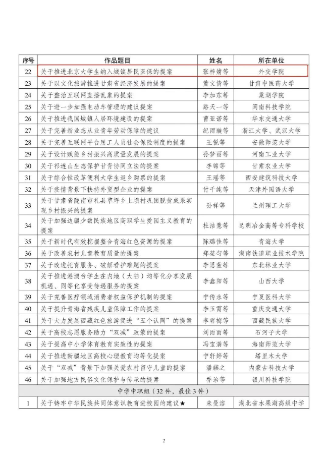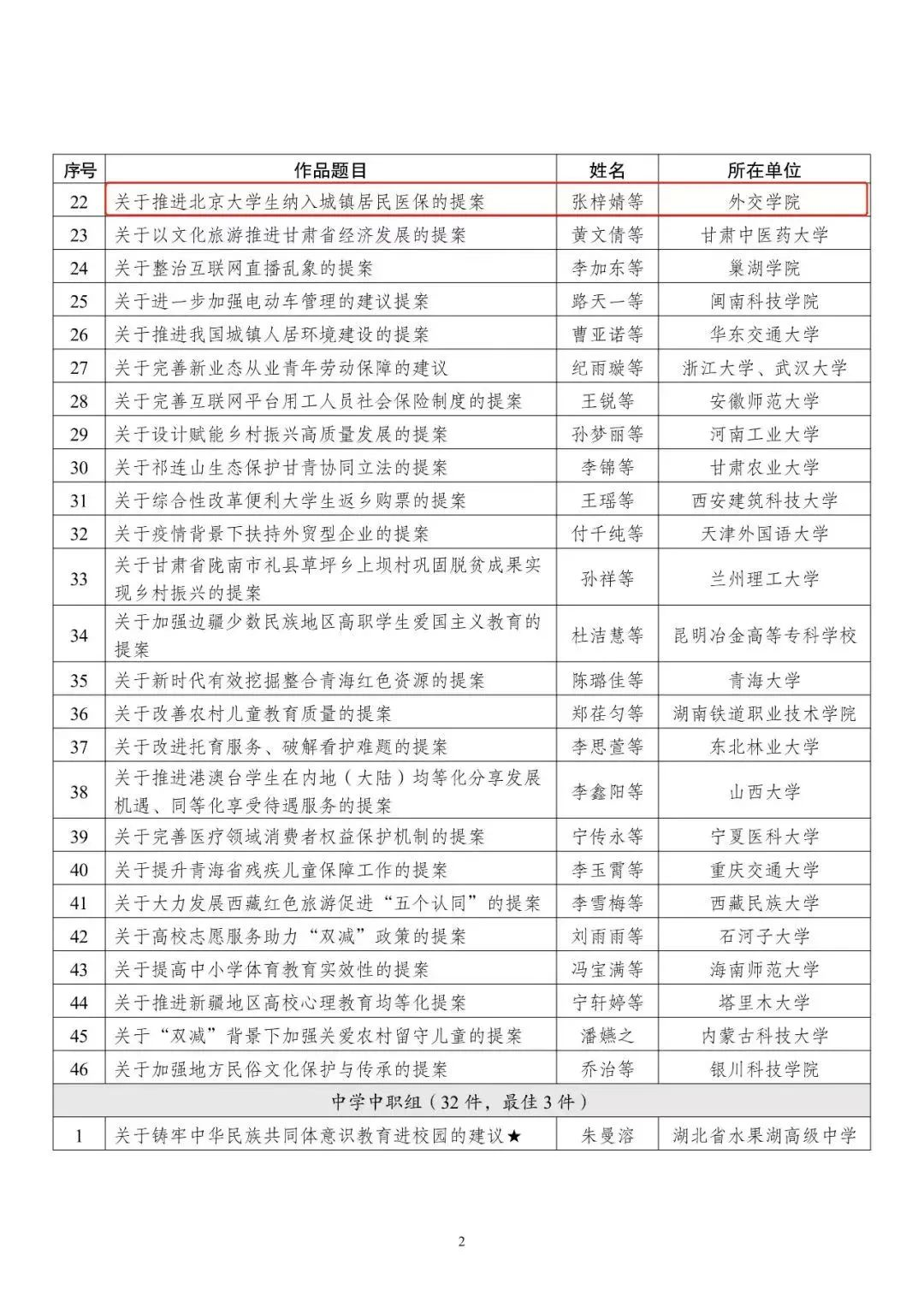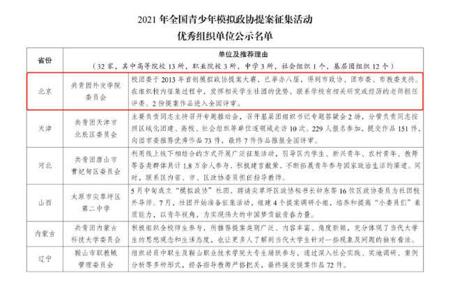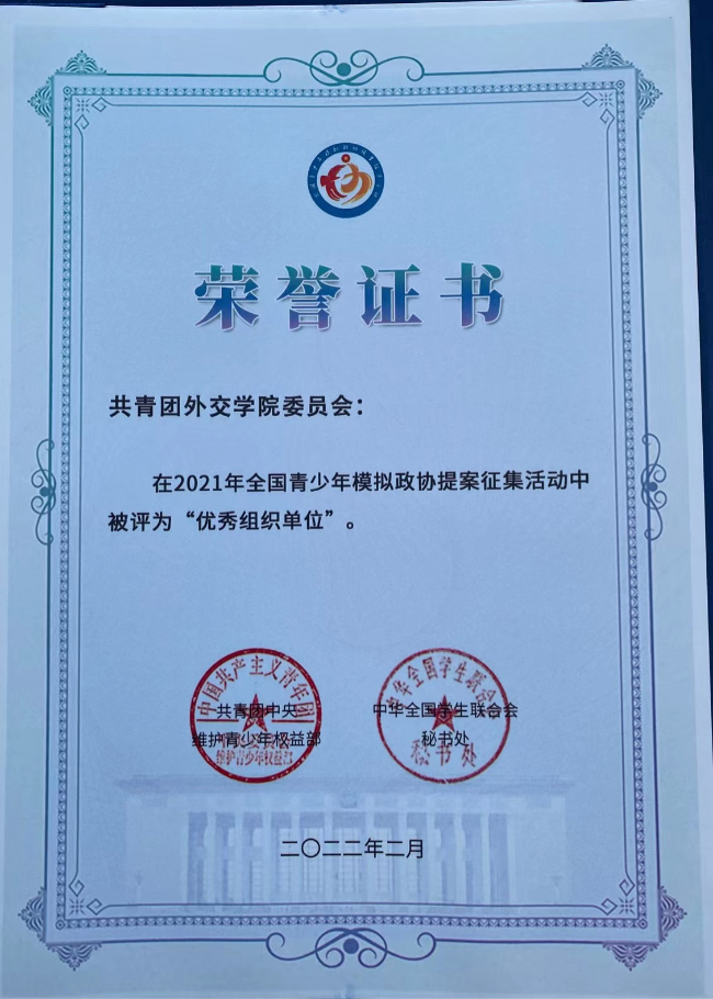 2021年全国青少年模拟政协提案征集活动获奖名单公布,校团委被评为“优秀组织单位”。同时,我校两份提案作品分别荣获大学组“最佳模拟政协提案作品”和“优秀模拟政协提案作品”。