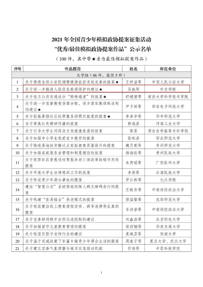 我校马驰等同学的提案作品——《关于进一步推进人脸信息数据保护的建议》被评为大学组“最佳模拟政协提案作品”。我校张梓婧等同学的提案作品——《关于推进北京大学生纳入城镇居民医保的提案》被评为大学组“优秀模拟政协提案作品”。这两份提案作品也是我校校内赛的获奖提案,自大赛创办以来,《关于修改北京市供暖时间气象参数标准的提案》、《关于北京快递业包装问题的调查及建议》等6份提案经成果转化,已作为正式提案被委员们提交至全国政协和北京市政协。