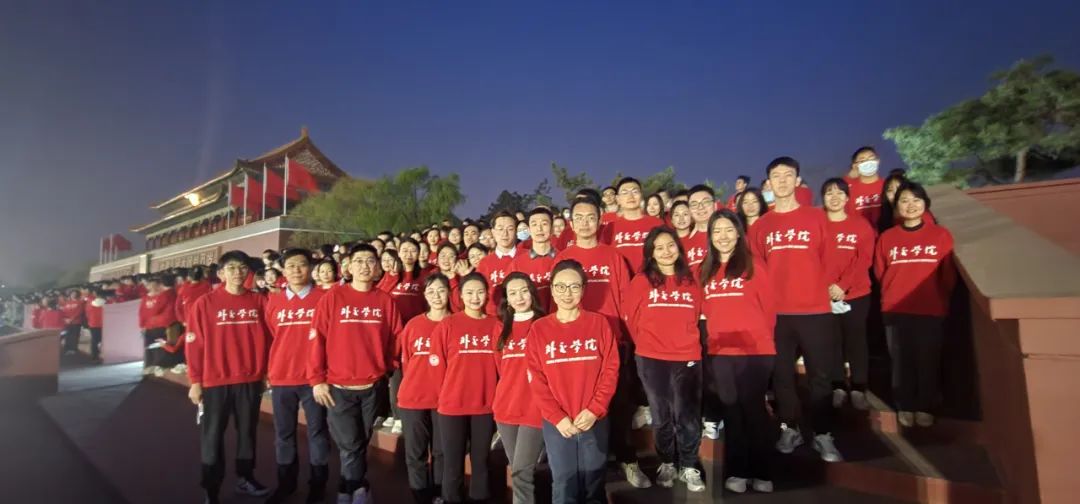 抵达观礼现场后,外院师生内心澎湃、精神振奋,满怀对党和祖国的热爱,与现场观众一道,等待着五星红旗冉冉升起的庄严时刻。