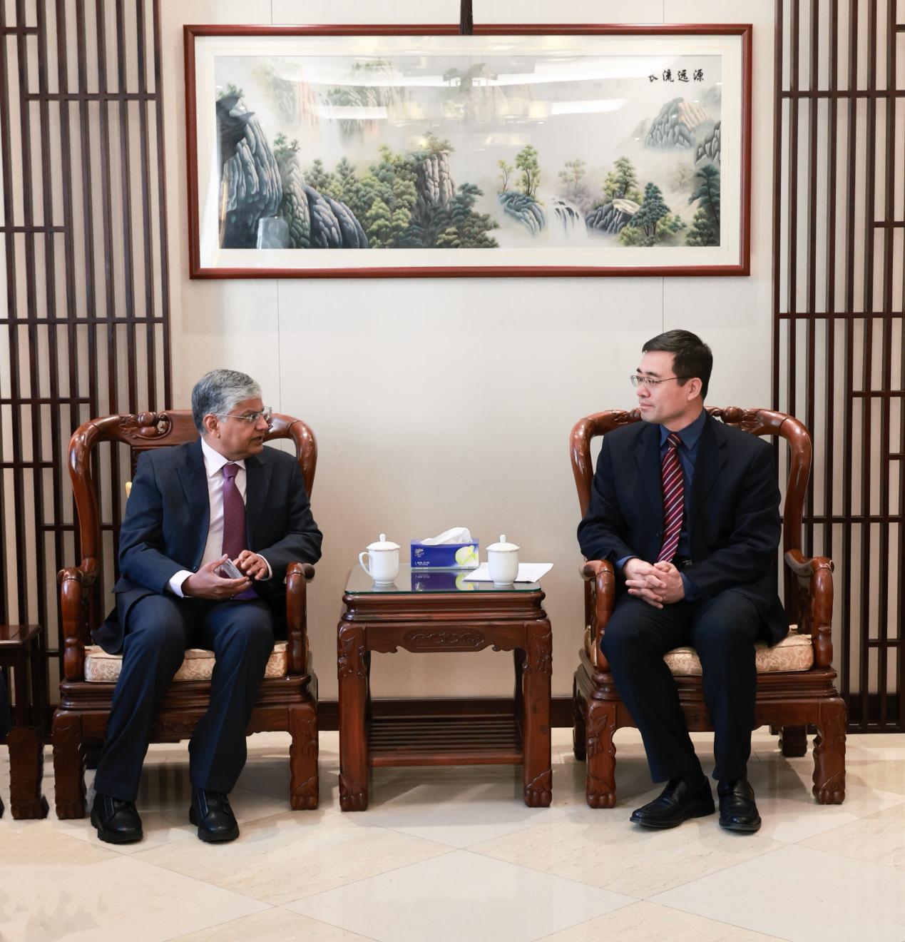 2025年12月24日,高飞院长会见印度驻华大使罗国栋Pradeep Kumar Rawat和一等秘书高谈Gautam Pandey(我院2018级校友),外事办公室主任马新宇等陪同会见。