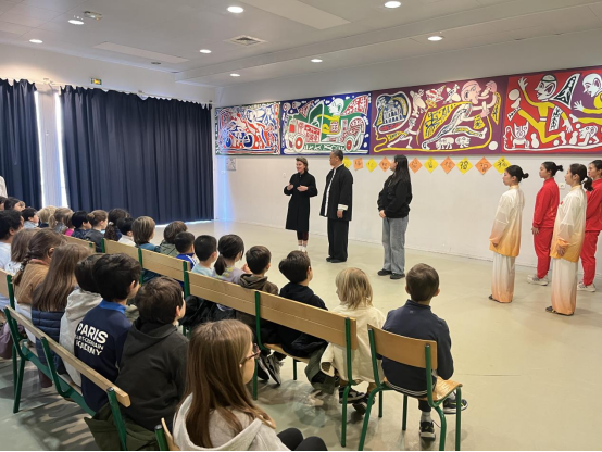 19日,早上,团组出发至巴黎tour d auvergne小学,入校进行太极拳教学。120多名法国小学生分为四组参加学练。