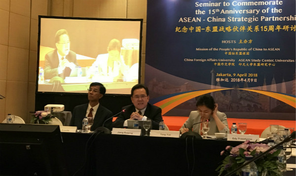 2018年4月9日,中国驻东盟使团、中国外交学院与印度尼西亚大学在雅加达共同举办“纪念中国—东盟战略伙伴关系15周年研讨会”。中国驻东盟大使黄溪连、东盟秘书长林玉辉、印尼外交部东盟事务高官何塞、东盟常驻代表委员会轮值主席、新加坡常驻东盟代表陈汉成出席开幕式并作主旨发言。外交学院副院长江瑞平作总结发言。来自中国和东盟国家、东盟秘书处、东盟对话伙伴国的高级官员、专家学者、媒体代表等约150人出席会议。外交学院组织国内11人专家代表团参会。