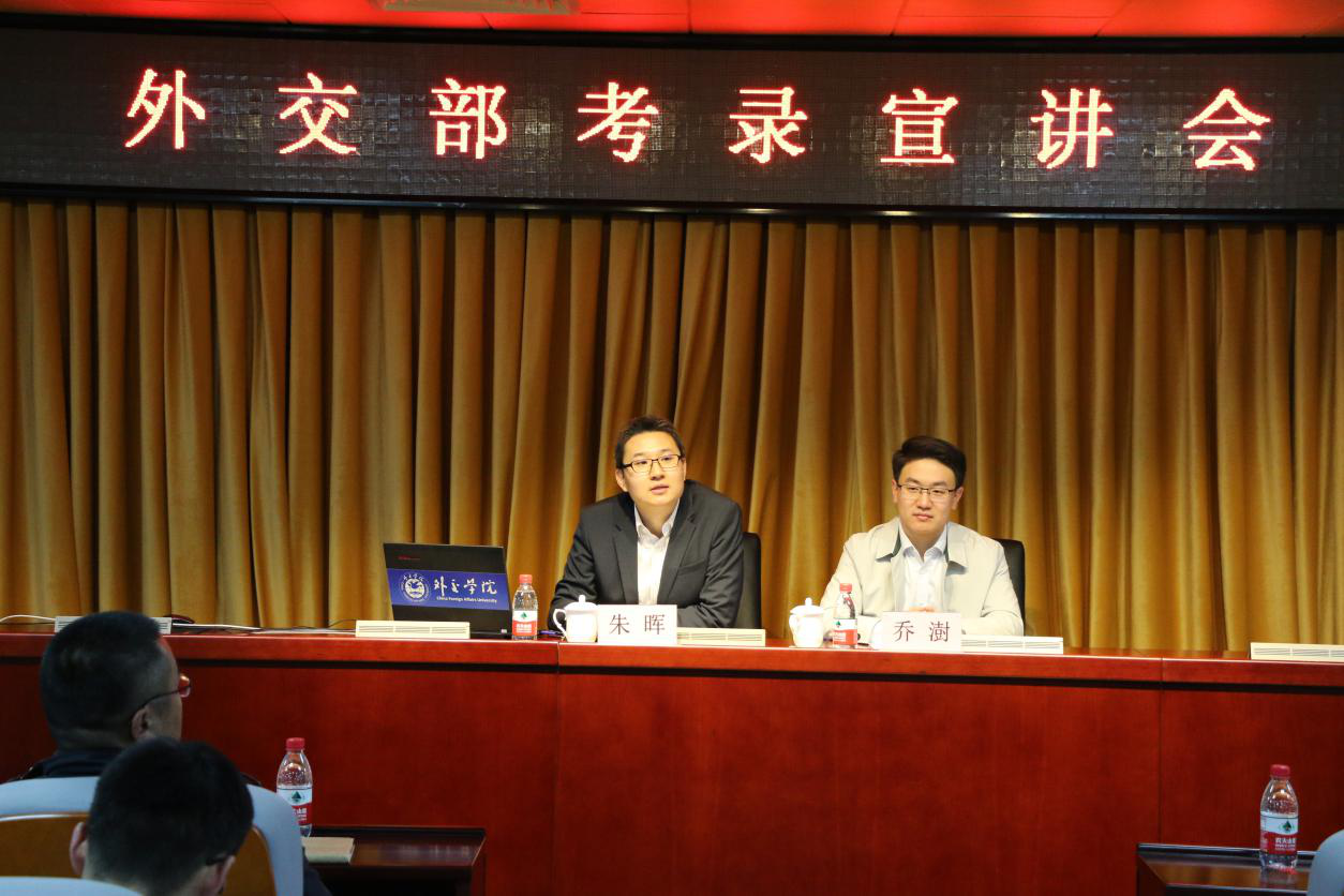 4月10日,2018年外交部考录宣讲会在我院沙河校区成功举办,外交部干部司考培处徐铁飞副处长、朱晖副处长以及我院2017届校友乔澍同志出席。宣讲会由学生处迟喜文副处长主持。