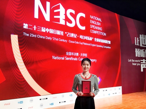 作为大一学生,在这项高水平的全国赛事中取得好成绩实属不易,在此祝贺丁青筠同学取得优异成绩!感谢英语系创新实践训练中心演讲团队各位老师的赛前辅导和培训,感谢学院相关部门的大力支持!
