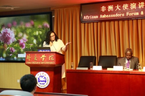 纳米比亚大使H.E Mr.George Kaiamo热情号召外交学院青年学子去了解非洲,同非洲青年一道积极参与非中合作与共同建设,助力非盟2063年愿景。他告诉同学们,非洲人口潜力巨大,将会成为一个巨大的潜在市场,且非洲人民是中国人民的朋友,非洲与中国也需要在国际舞台上联手共同发声、共进退。
