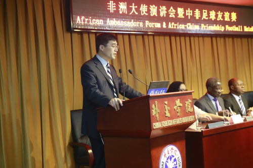 首先,我院院长助理高飞教授代表外交学院全体师生,热烈欢迎非洲大使们的到来,并介绍了外交学院。高教授表示自己对中国四十多年来的经济发展和中非友谊的进展非常满意,同时提到中国在足球方面还有提升的空间,希望此次讲座能促进中非友谊并提高中国的足球水平,最后他对作为文化传播使者的大使们表示感谢,并预祝此次讲座圆满成功。
