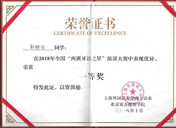 由上海外国语大学西方语系主办,北京塞万提斯学院协办,以全国开设西班牙语专业的高校本科学生为参赛对象的全国“西班牙语之星”演讲大赛决赛,于2018年10月20日在上海外国语大学(松江校区)举行。共有来自全国57所院校的382名选手报名参赛。低年级组12名选手、高年级组13名选手在经历初赛的激烈角逐后脱颖而出,进入本届大赛决赛。我院外语系西班牙语专业大二2017313班的韩静怡同学在决赛中荣获一等奖。