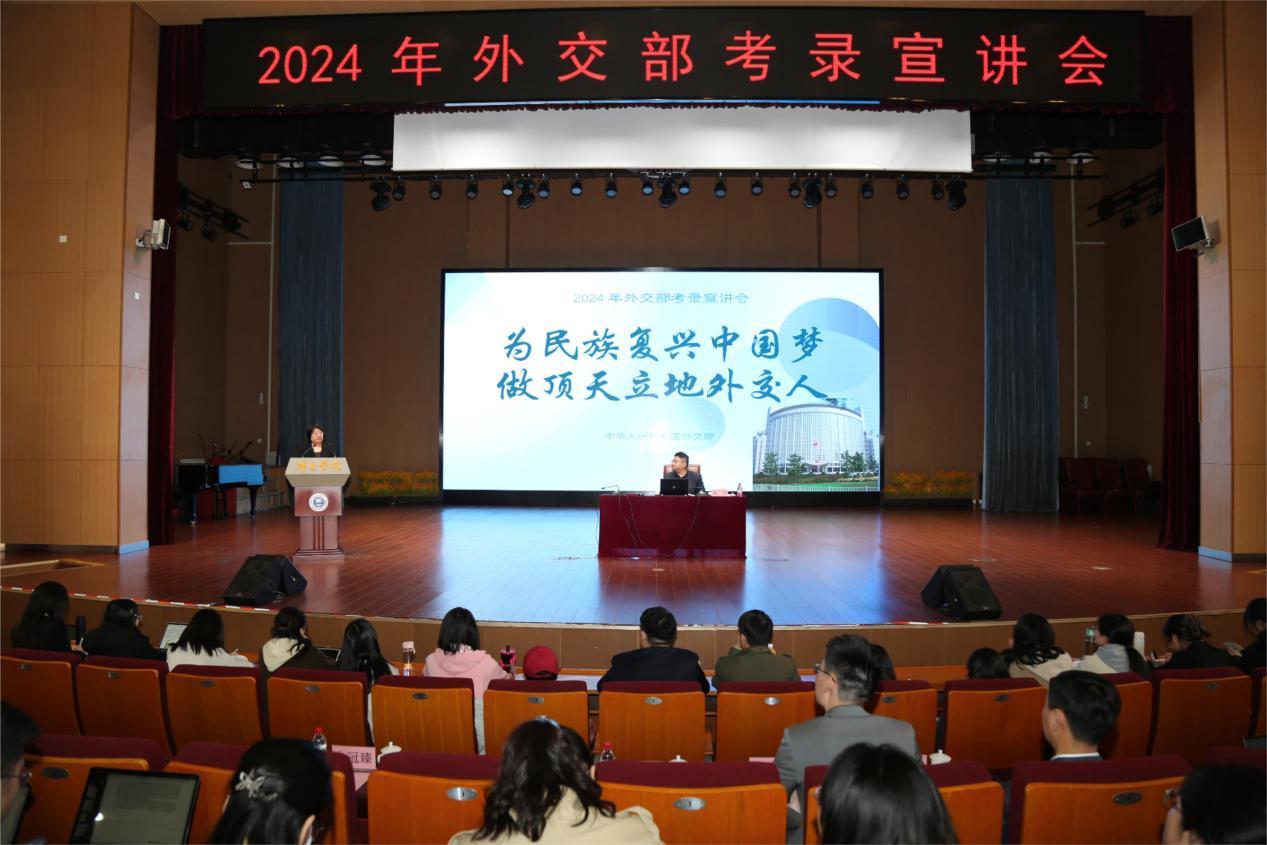 2024年4月10日,“2024年外交部考录宣讲会”在我院沙河校区礼堂举办。外交部非洲司副司长周平(1994级法语专业校友)、驻香港公署参赞钱珺珺(1999级英语专业校友)、干部司考录培训处副处长丁学勇、考培处三秘朱冠臻(2012级英语专业校友)担任宣讲嘉宾,学院专职党委副书记安青主持,全校师生800余人参加。