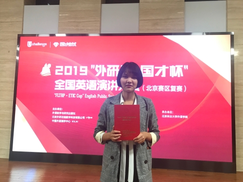 2019年11月3日,2019“外研社•国才杯”全国英语演讲大赛北京赛区复赛在北京林业大学举行。英语系本科二年级学生刘晓晓代表我院参加了比赛,与来自北京几十所高校的45名优秀选手同台竞技,取得了一等奖的好成绩。