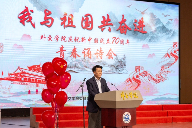 诵诗会开始,学院党委书记齐大愚大使讲话。他指出,此次诵诗会既是学院师生共同庆祝新中国成立70周年的活动,也是学院开展“不忘初心、牢记使命”主题教育的一部分。希望同学们在聆听、朗诵诗歌的过程中认真回顾新中国外交事业发展历史,秉承优良传统,不忘初心、牢记使命,努力成为新时代高素质复合型外交人才,与时代齐发展、与祖国共奋进。
