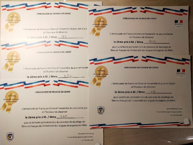 2019年12月1日,第十届全国高校法语电影配音大赛决赛在北京外国语大学举办。初选阶段,经过校内的激烈角逐,外语系最终选拔出傅晟、王淳、赵菲儿、李可欣、苏颖莹五位同学代表外交学院参赛,同来自北京大学、北京外国语大学、浙江大学等多所高校的16支参赛队伍在决赛的赛场上展开较量,并取得全国二等奖的佳绩。