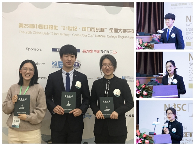 在此热烈祝贺我院三位获奖同学!同时,向参与比赛筹备工作的所有教师和学生志愿者表示感谢!感谢英语系创新实践训练中心演讲团队的赛前指导和培训!感谢学院相关部门的大力支持!