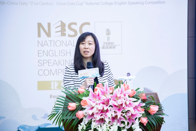 英语系主任石毅教授为大赛致辞。她回顾了外交学院与“21世纪杯”全国大学生英语演讲比赛的合作历程,对本届比赛北京赛区决赛在外交学院成功举办表示热烈祝贺。石毅教授简要介绍了外交学院英语系在学生英语演说和辩论能力培养方面所取得的成绩,感谢该平台为全国大学生展示英语风采提供了宝贵的机会,并希望外交学院能与中国日报社和各兄弟院校一起助力中国外语教育,为国家输送更多优秀外语人才。