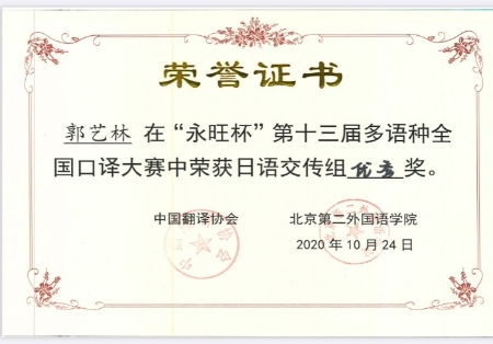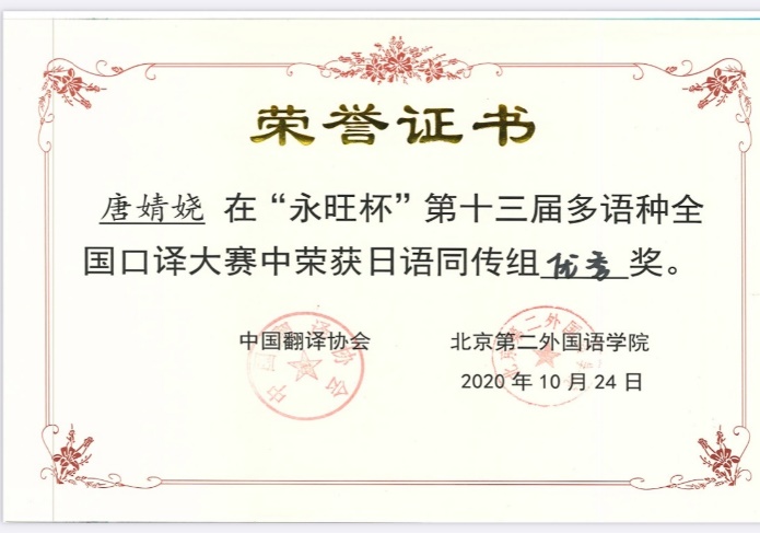 2020年10月24日,第十三届“永旺杯”多语种全国口译大赛落下帷幕。我院法语专业苏哲扬同学获得法语交传组组亚军(二等奖第一名),日语专业唐婧娆同学、郭艺林同学分别获得日语同传组和交传组优秀奖,西语专业荣杰同学获得西语交传组优秀奖。