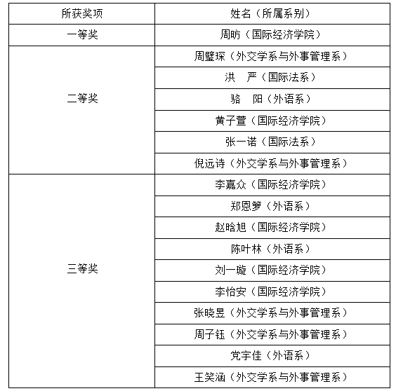 国际经济学院2018级周昉同学以优异的成绩脱颖而出,代表我院于2020年11月22日参加了全国大学生英语竞赛北京赛区决赛。周昉同学和来自北京近50所高校的306名同学一同激烈角逐,通过层层选拔,喜获一等奖。至此,2020年全国大学生英语竞赛北京赛区初赛和决赛顺利结束,我院在此次竞赛中共有17名同学获奖,获奖名单如下:
