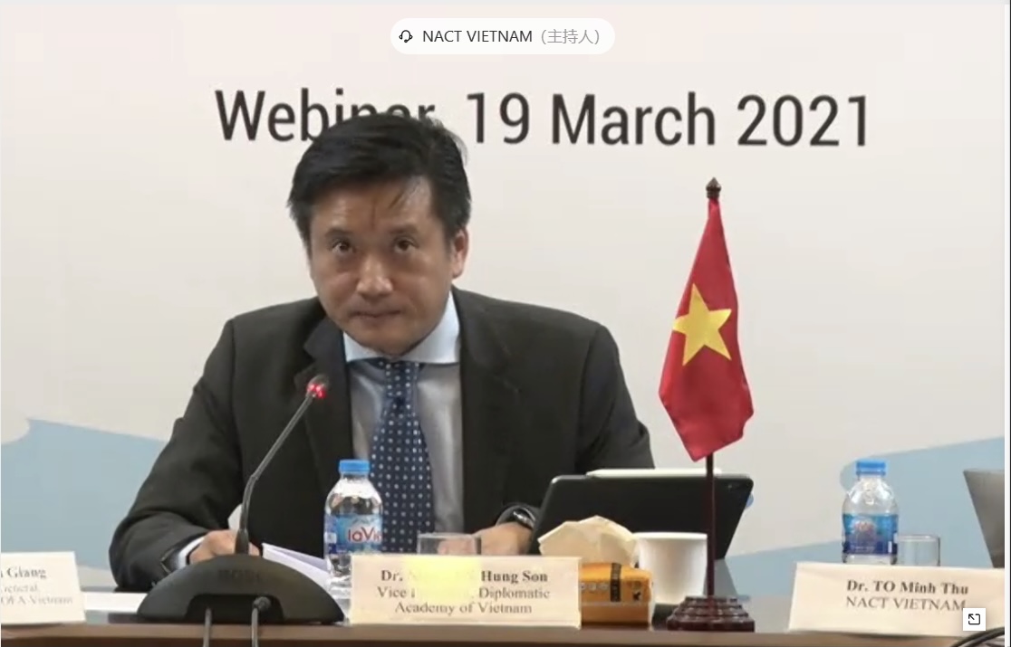 阮鸿声副院长表示,在全体NACT同仁的支持下,NACT越南圆满完成了2020年东盟方联合主席的任务,并特别感谢NACT中国的支持与合作。过去一年,NACT克服了新冠肺炎疫情的挑战,成功举办了三次视频工作组会议,相关研究成果获得中国—东盟官方认可。