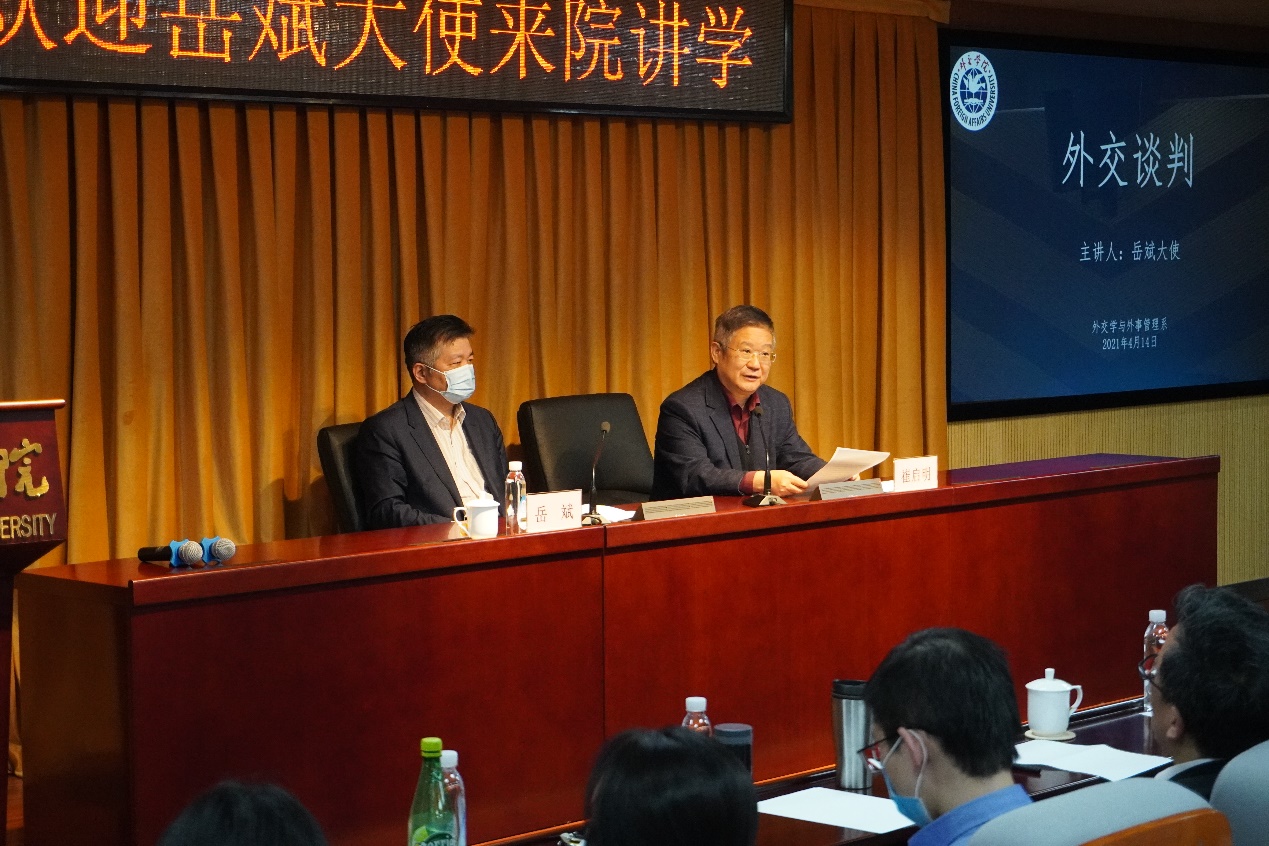 外交谈判是外交官的核心业务能力,也是外交业务与艺术的综合体现。为提高师生对外交谈判的认识和理解,激发同学们投身祖国外交事业的热情,2021年4月14日中国前驻格鲁吉亚共和国、塔吉克斯坦共和国特命全权大使岳斌同志应邀在我院沙河校区作了“外交谈判”主题讲座。外交学院党委书记崔启明大使主持,我院师生200余人参加了讲座。