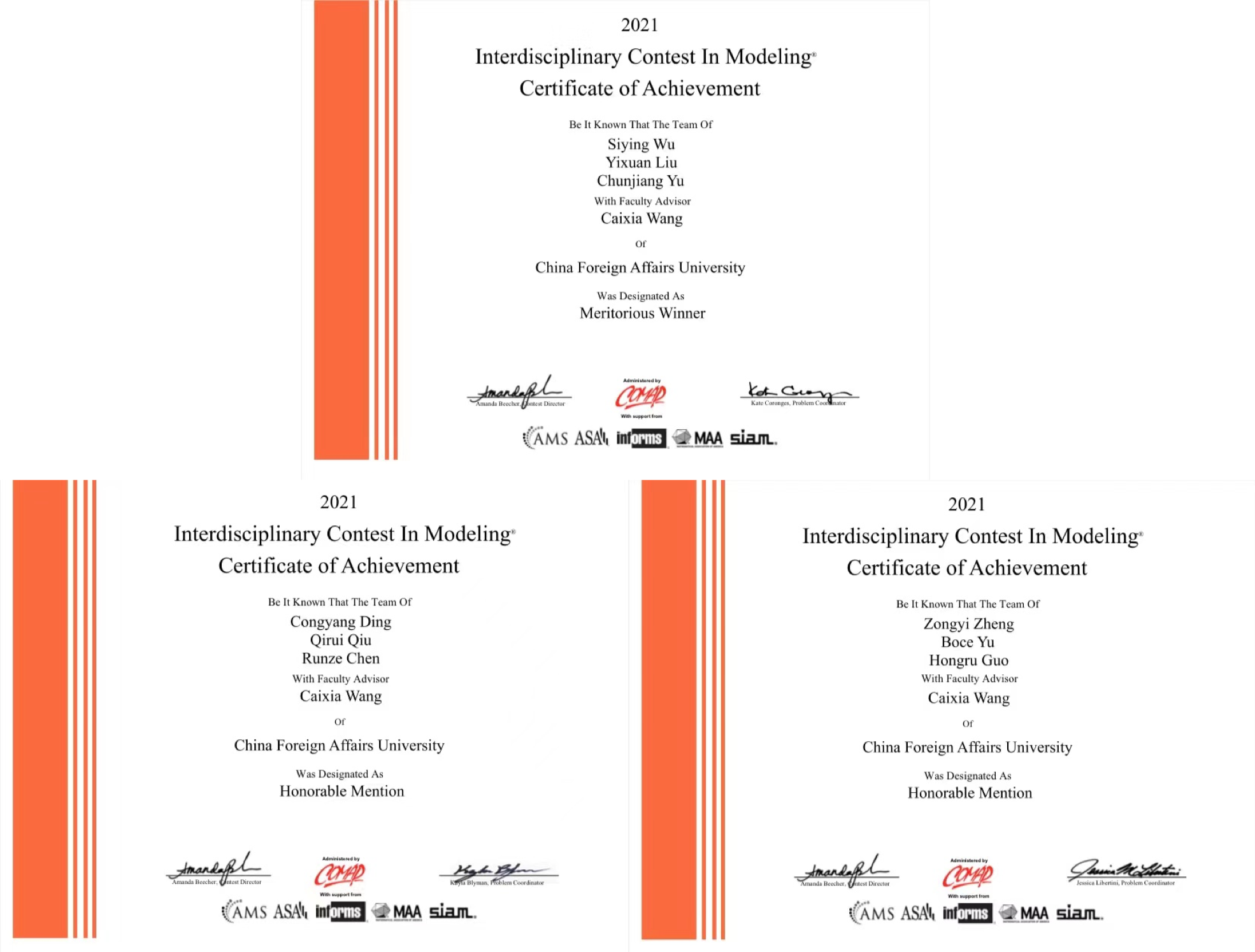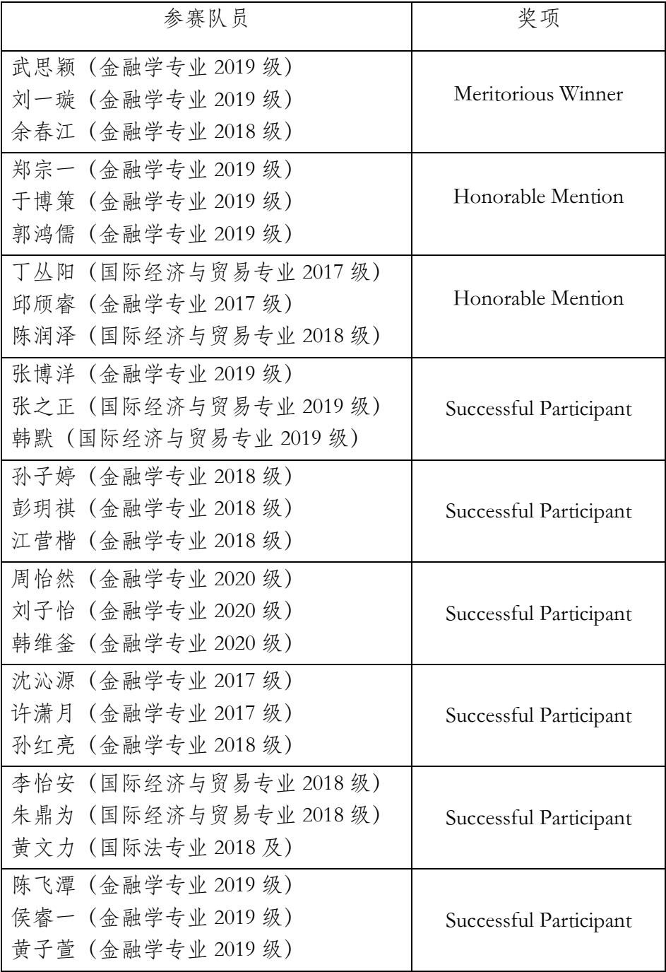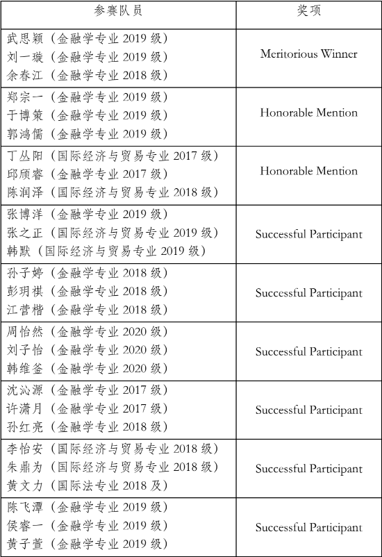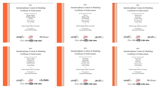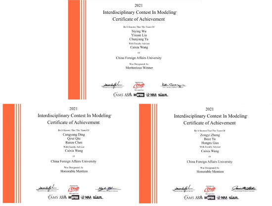 2021年美国大学生数学建模竞赛和交叉学科竞赛(MCM/ICM,简称“美赛”)在美国东部时间2021年2月4至8日(北京时间2021年2月5至9日)举行。在国际经济学院的组织下,我校27名学生组成9支队伍参加此次竞赛,最终获得国际一等奖(Meritorious Winner,简称“M奖”)1项、国际二等奖(Honorable Mention,简称“H奖”)2项,国际三等奖(Successful Participant,简称“S奖”)6项。