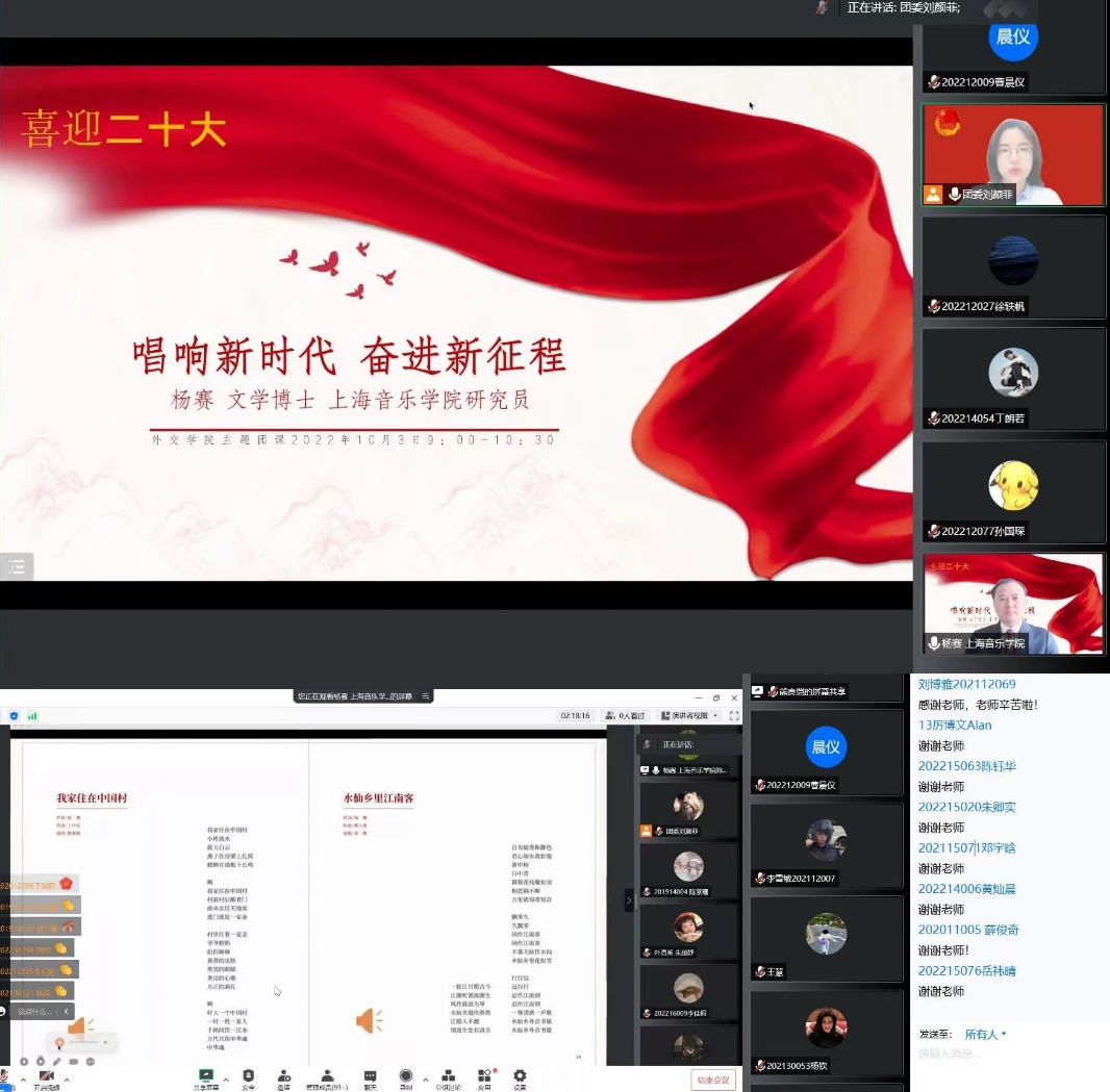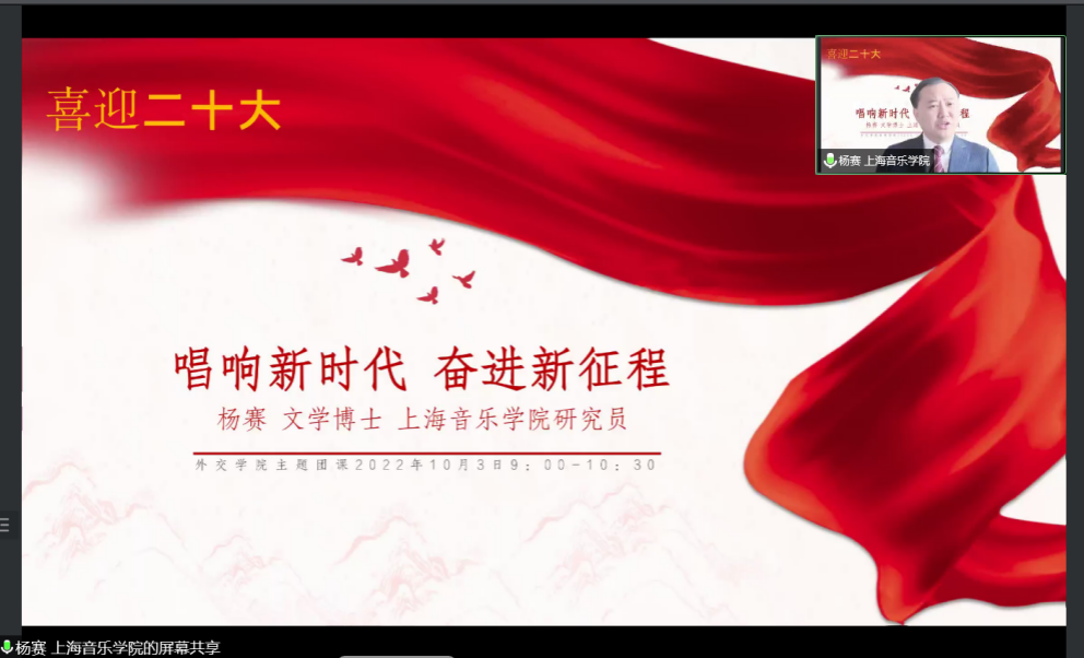 为迎接党的二十大胜利召开,激励我院学子深刻领悟“两个确立”的决定性意义,不断增强“四个意识”、坚定“四个自信”、做到“两个维护”,树立正确的审美观念,陶冶高尚的道德情操,外交学院团委特邀请上海音乐学院研究员杨赛老师于2022年10月3日上午讲授题为“喜迎二十大 唱响新时代 奋进新征程”的线上团课,我院共500余名学生参加。