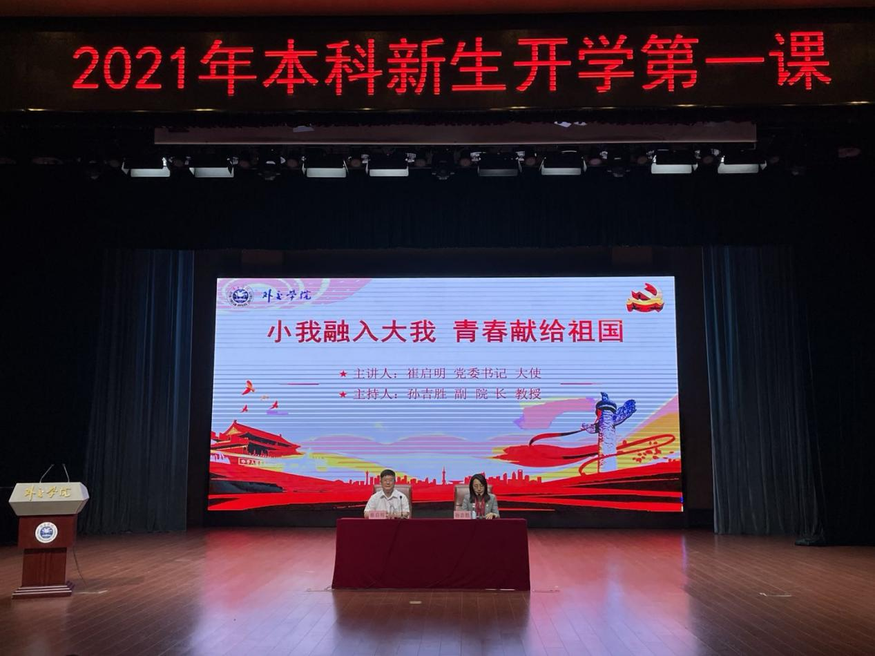 为了学习贯彻习近平总书记“七一”重要讲话精神,引导本科新生深刻领悟伟大建党精神和党的光荣传统,传承外交学院的红色基因,鼓励本科新生把个人的理想追求融入党和国家事业之中,为党为祖国为人民多作贡献,积极投身新时代中国特色大国外交,为中华民族的伟大复兴贡献力量,9月7日下午,院党委书记崔启明大使以“小我融入大我、青春献给祖国”为主题,在沙河校区礼堂为2021级全体本科新生讲授“开学第一课”。外交学院副院长孙吉胜教授主持。
