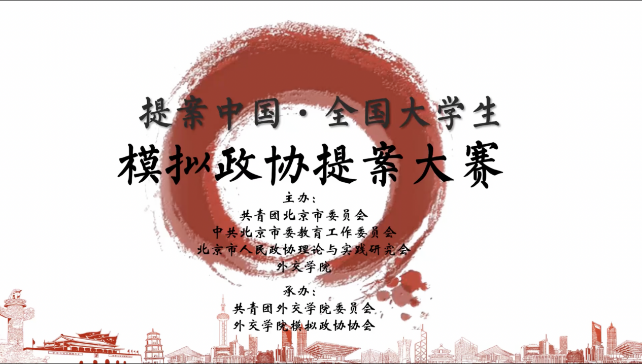 2022年5月29日,第九届提案中国·全国大学生模拟政协提案大赛决赛于线上举办。本次大赛由北京团市委、北京市教工委、北京市人民政协理论与实践研究会、外交学院共同主办,外交学院团委、外交学院模拟政协协会承办。来自清华大学、北京大学等40所在京知名高校组成74支高校代表队参加,北京中学特组中学生代表队参与。北京市政协副秘书长、研究室主任陈煦,外交学院党委副书记安青出席决赛开幕式并致辞。